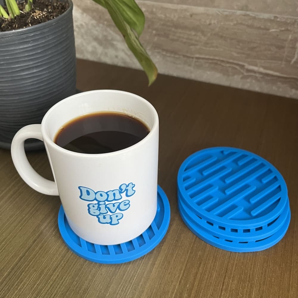 Set de 4 posavasos en silicona color azul. pueden utilizarse tanto para bebidas frias como calientes. medida de cada posavaso: 10 cms de diamtro
