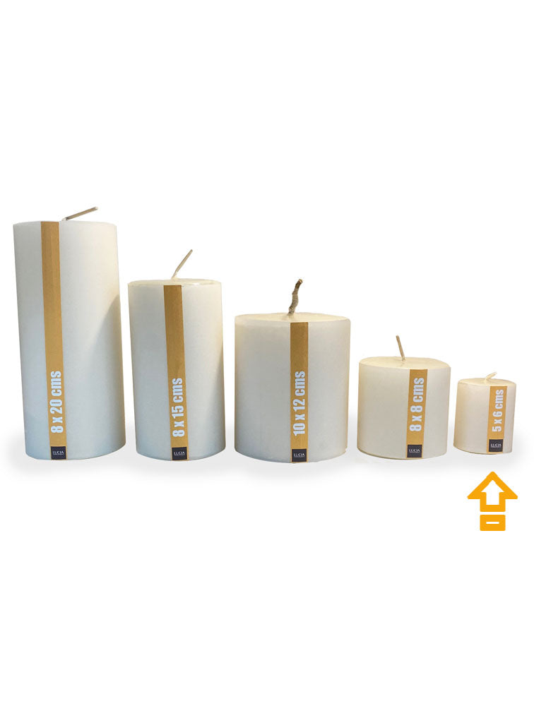 Vela blanca que mide 5x6 cms. cuando la vela se derrite, las paredes externas se mantienen y se quema hacia el interior.