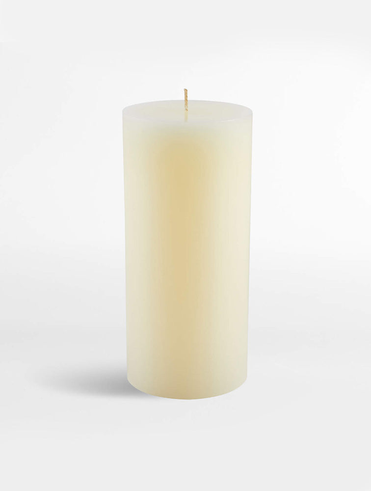 Vela blanca que mide 8x15 cms. cuando la vela se derrite, las paredes externas se mantienen y se quema hacia el interior.