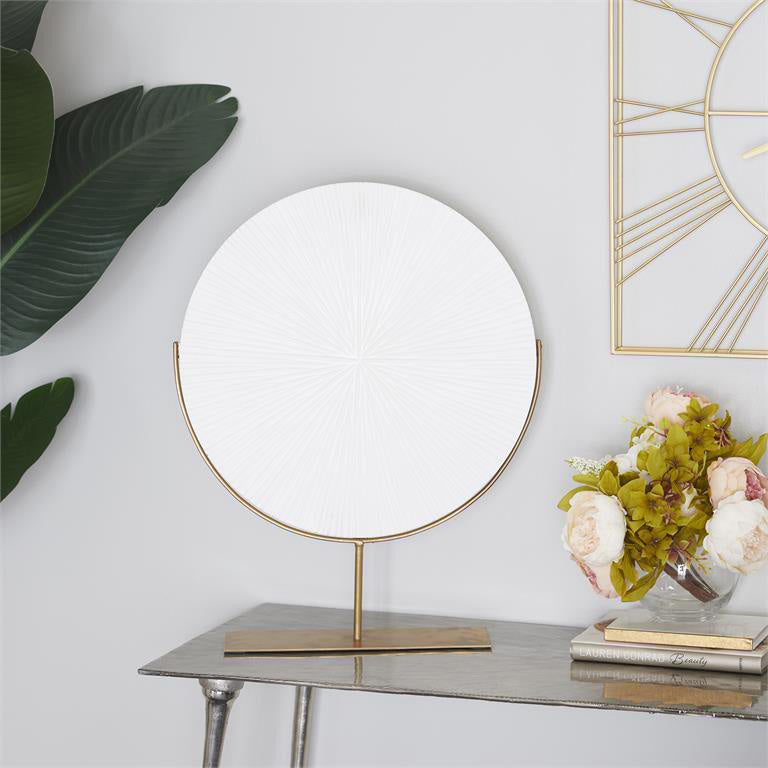 ESCULTURA DE MADERA BLANCA REDONDA CON BASE METAL X6805
