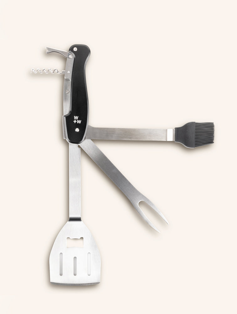 Herramienta multiusos para parrilla. tiene espatula, pincel de silicona y trinche.