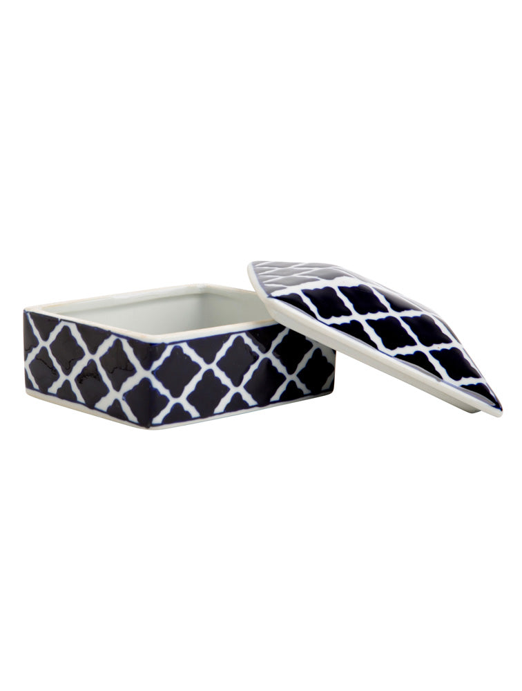 Caja cuadrada azul y blanca de ceramica con tapa. mide 13.46 cms x 10.93 cms por ambos lados y 6.35 cms de alto.