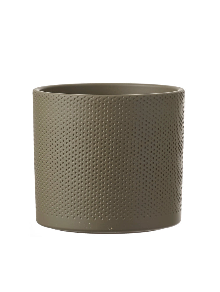 Macetero de cerámica con diseño geométrico en verde militar. mide 22.86 cms de diámetro x 21.50 cms de alto.