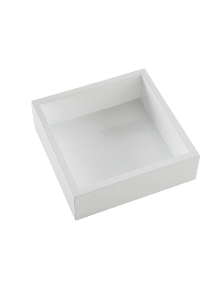 Servilletero blanco de madera para servilletas de cocktail. mide 15.25 cms por lado x 3.80 cms de alto.