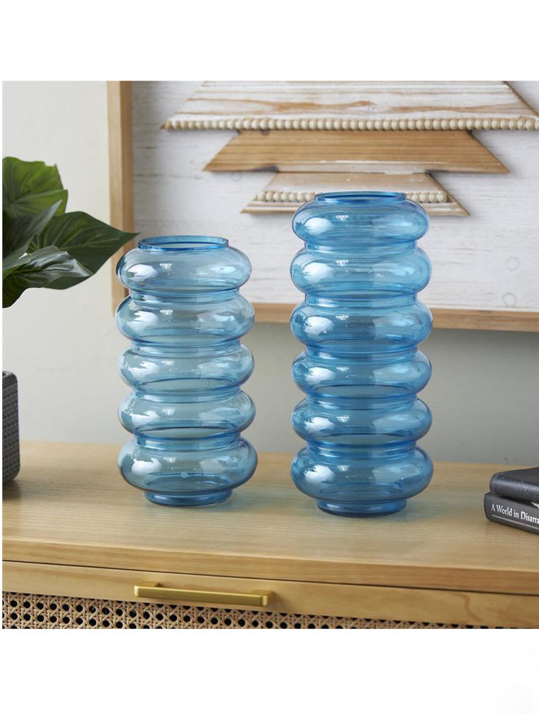 Florero chico de vidrio celeste. mide 14.85 cms de diametro x 27.70 cms de alto.