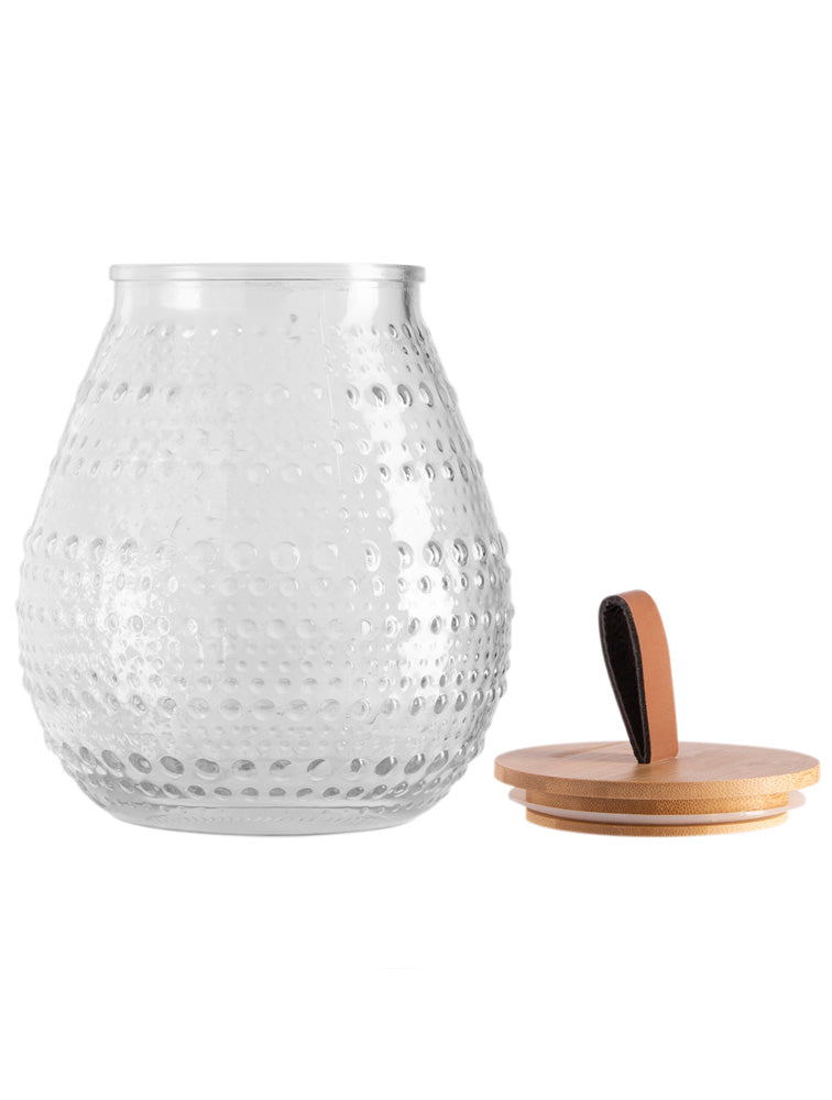 Canister o pomo, ideal para dulces o galletas. con cierre hermetico y tapa de madera. mide 33 cms de diametro x 18 cms de alto.
