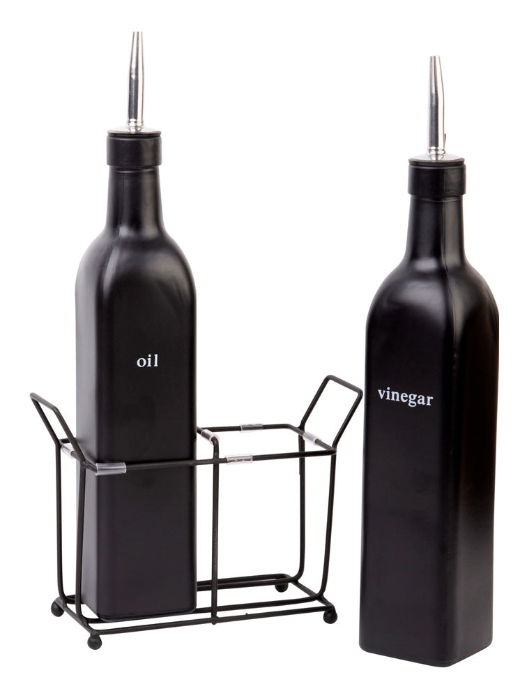 Alcuza de ceramica negra para aceite y vinagre sobre base de fierro. cada botella mide 5 cms por lado x 25.40 cms de alto. tiene una capacidad de medio litro