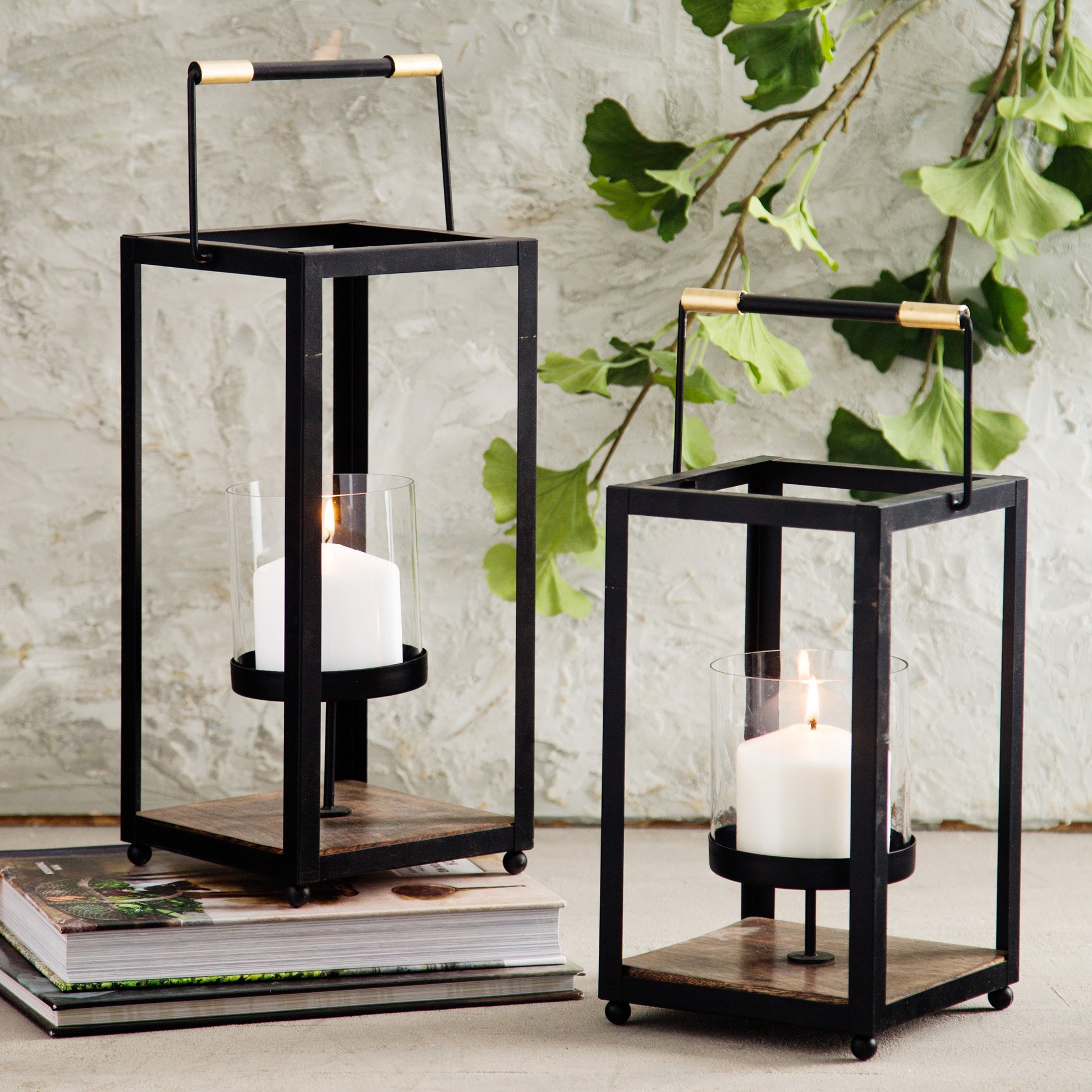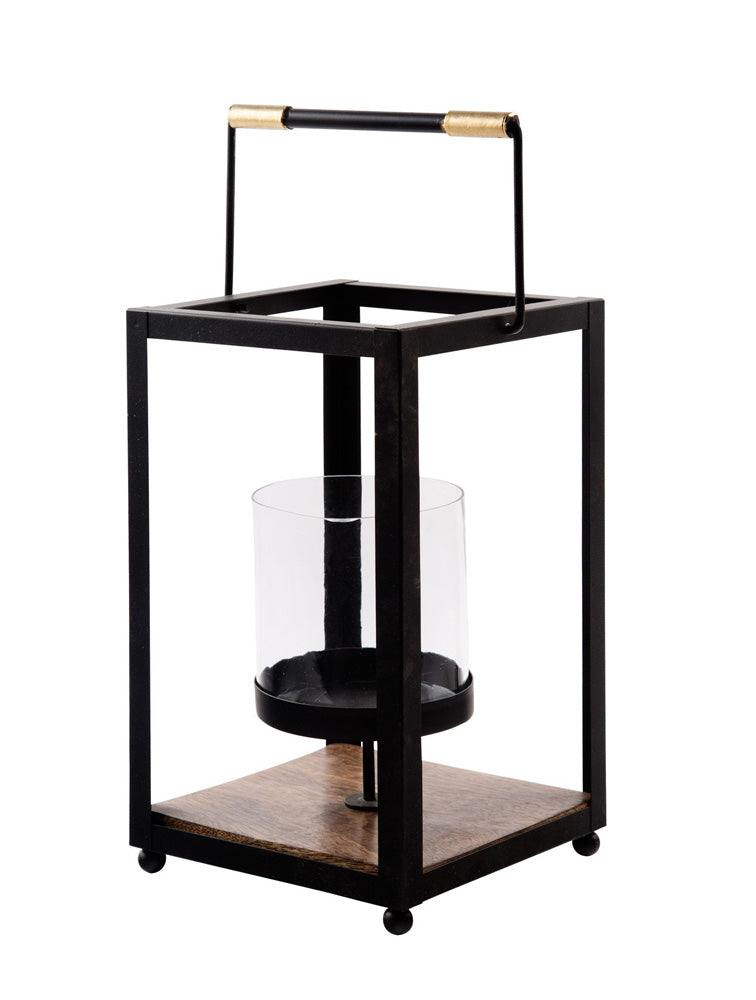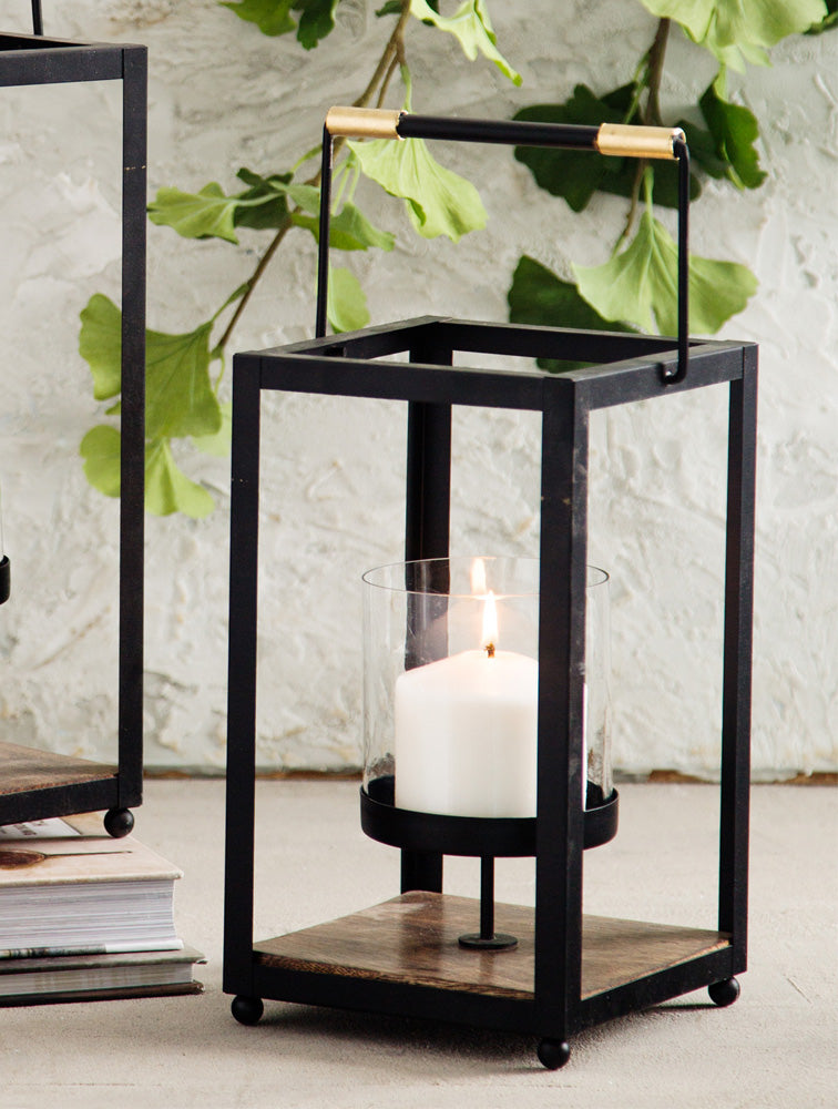 Fanal de metal negro con protector de vidrio para velas. mide 15.25 cms por lado x 25.40 cms de alto.