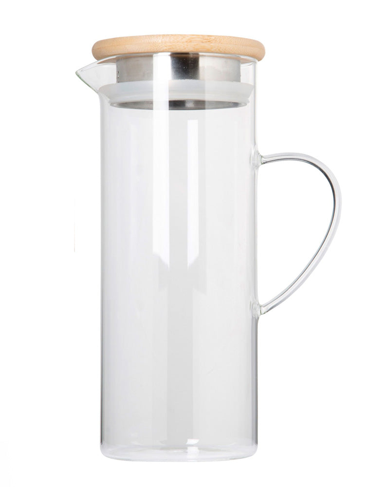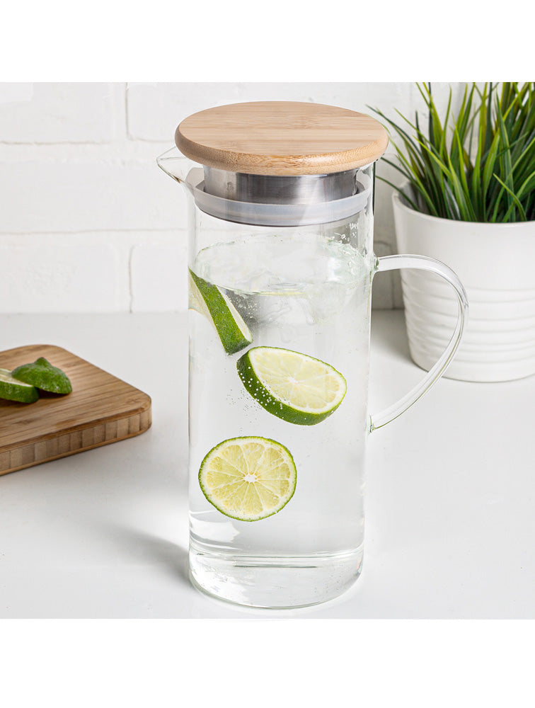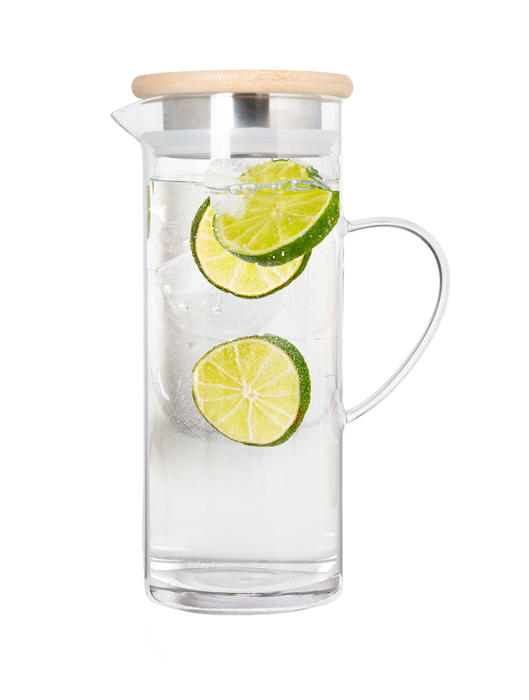 Jarra de vidrio con tapa hermetica de madera con acero inoxidable, tiene una capacidad de 1.65 litros.