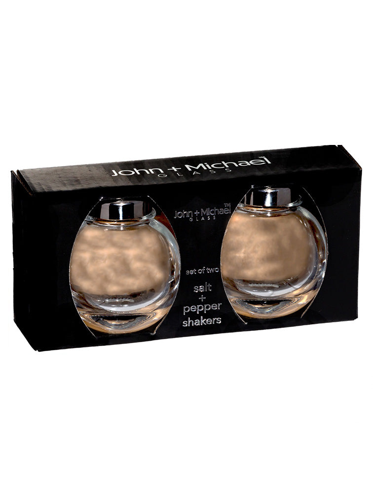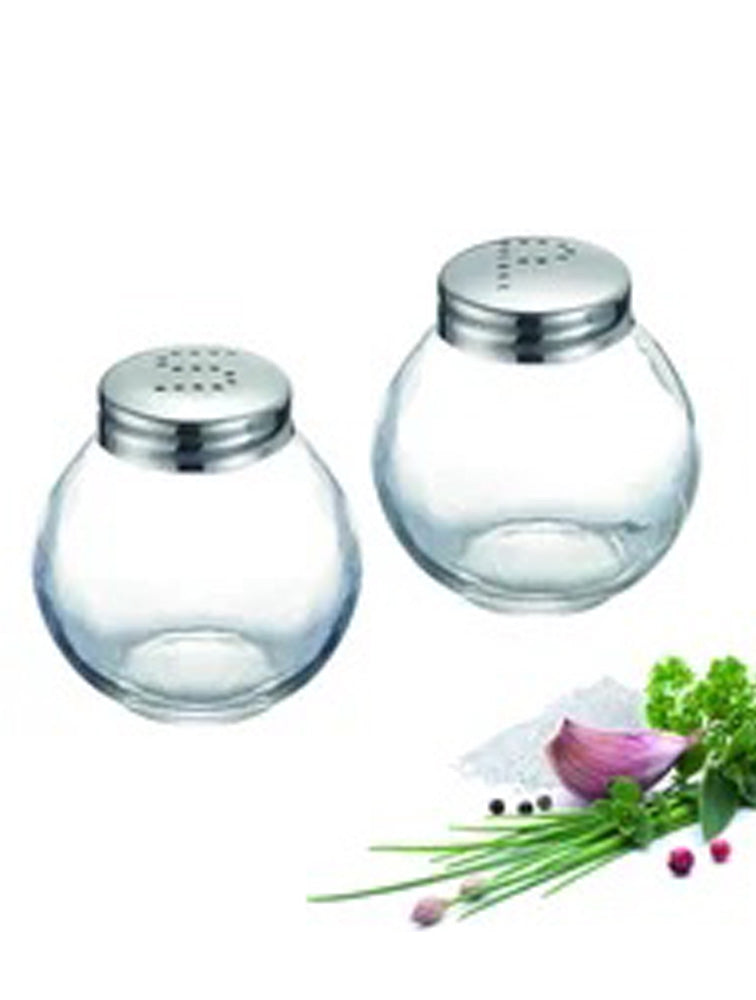 Salero y pimentero redondo de vidrio con tapa de metal. cada uno mide 6.35 cms de diametro x 7.20 cms de alto.