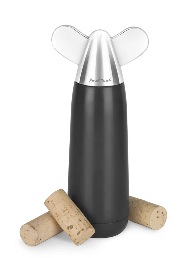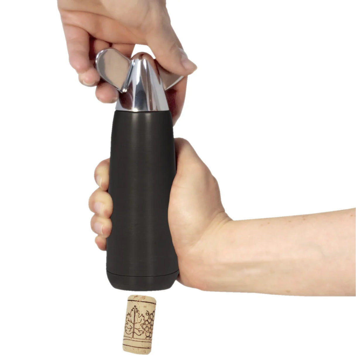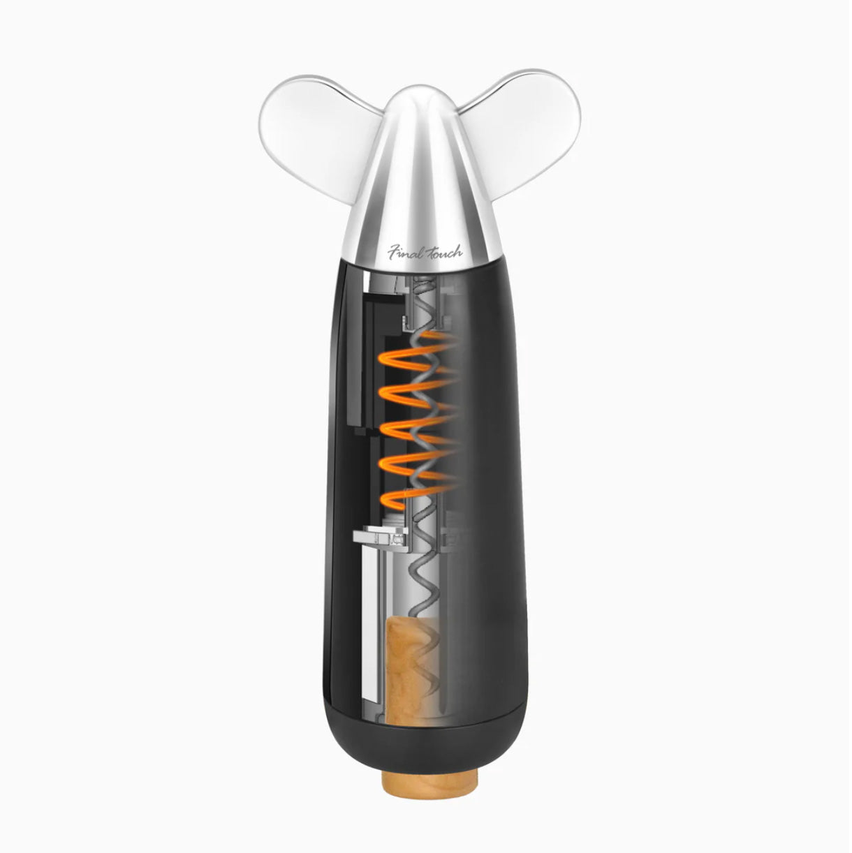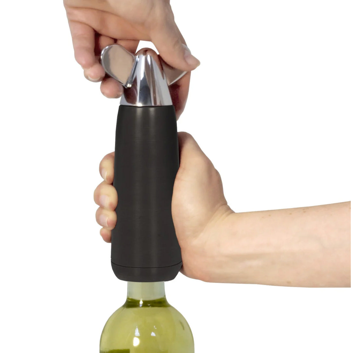Sacacorcho de fácil uso. simplemente coloque el descorchador sobre la botella, gire las aletas superiores y el primer giro será tan fácil como el íšltimo. el exclusivo mecanismo spring assist aplica presión al corcho y lo saca sin tirar.