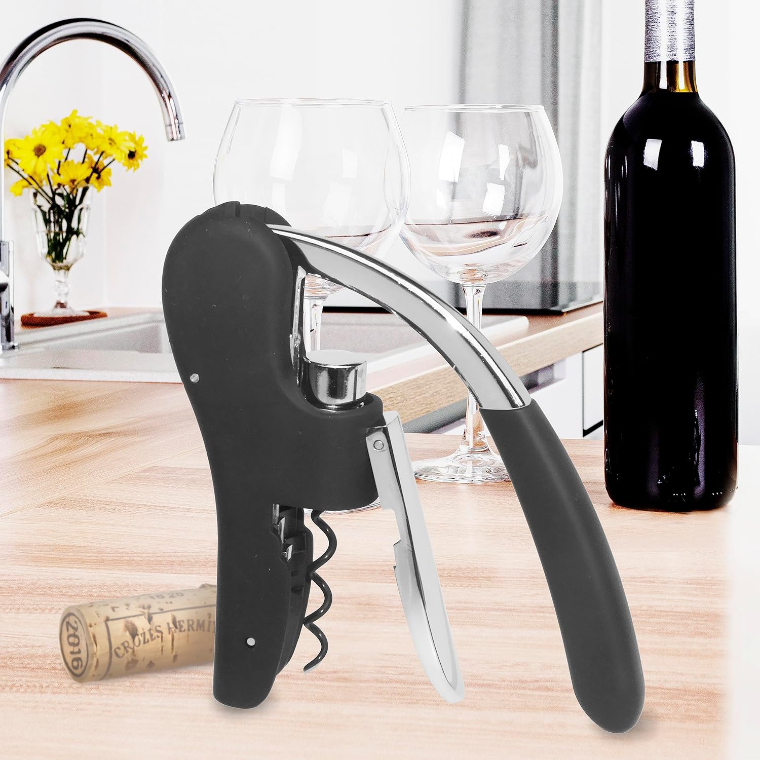 Sacacorchos de palanca marca oggi, diseño vertical, sinfín antiadherente y fácil extracción del corcho sin torsión - negro/acero inoxidable.
