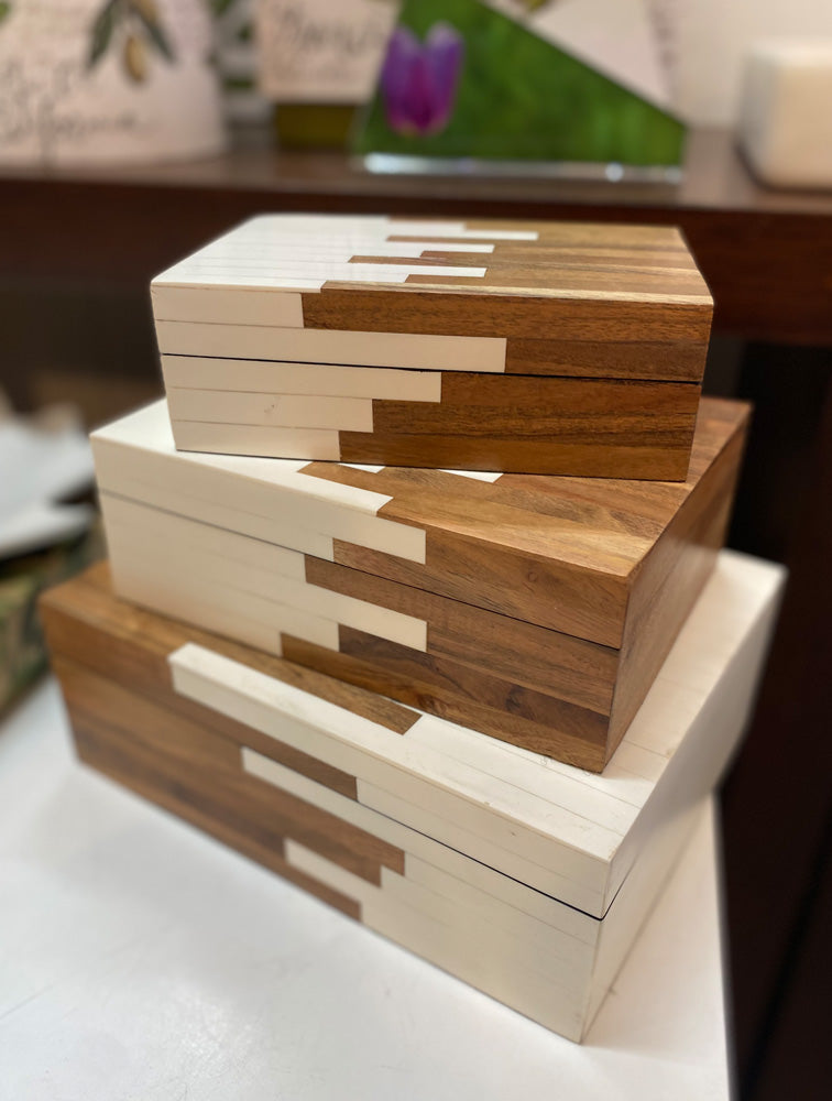 Caja de resina con enchape tipo nacar en 2 tonos (natural y blanco). medidas: grande 22.9 cms