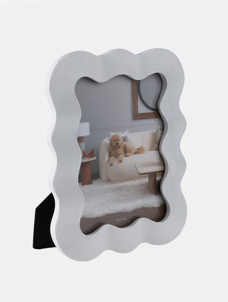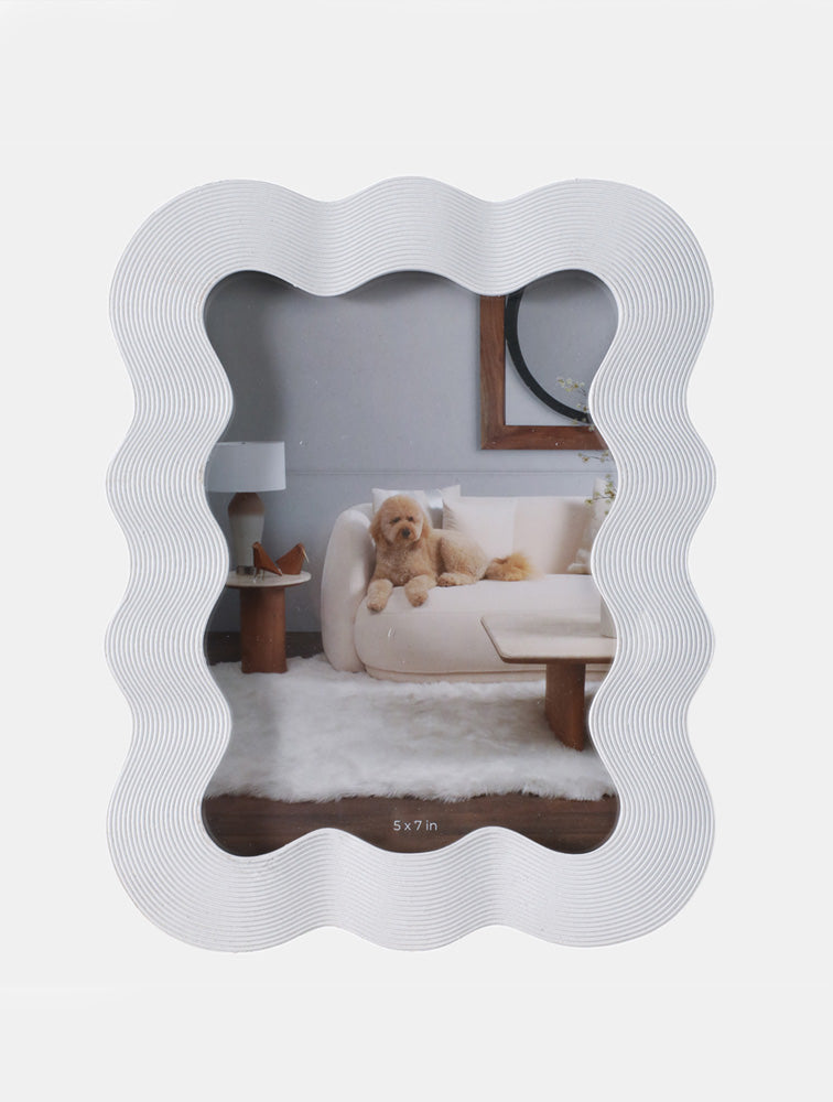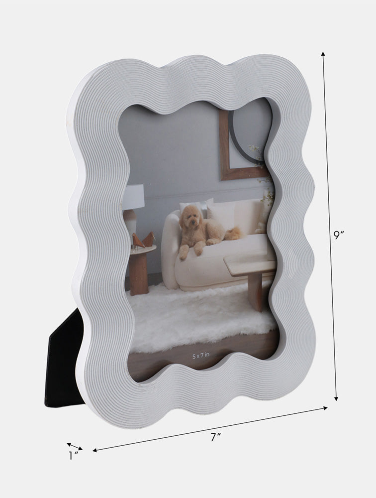 Marco de fotos en poliresina en color blanco con endiduras de forma ondulada. para colocar una foto de 5x7 inc (12.7 x 17.8 cms) medida del marco: 17.8 x 2.5 x 22.86 cms