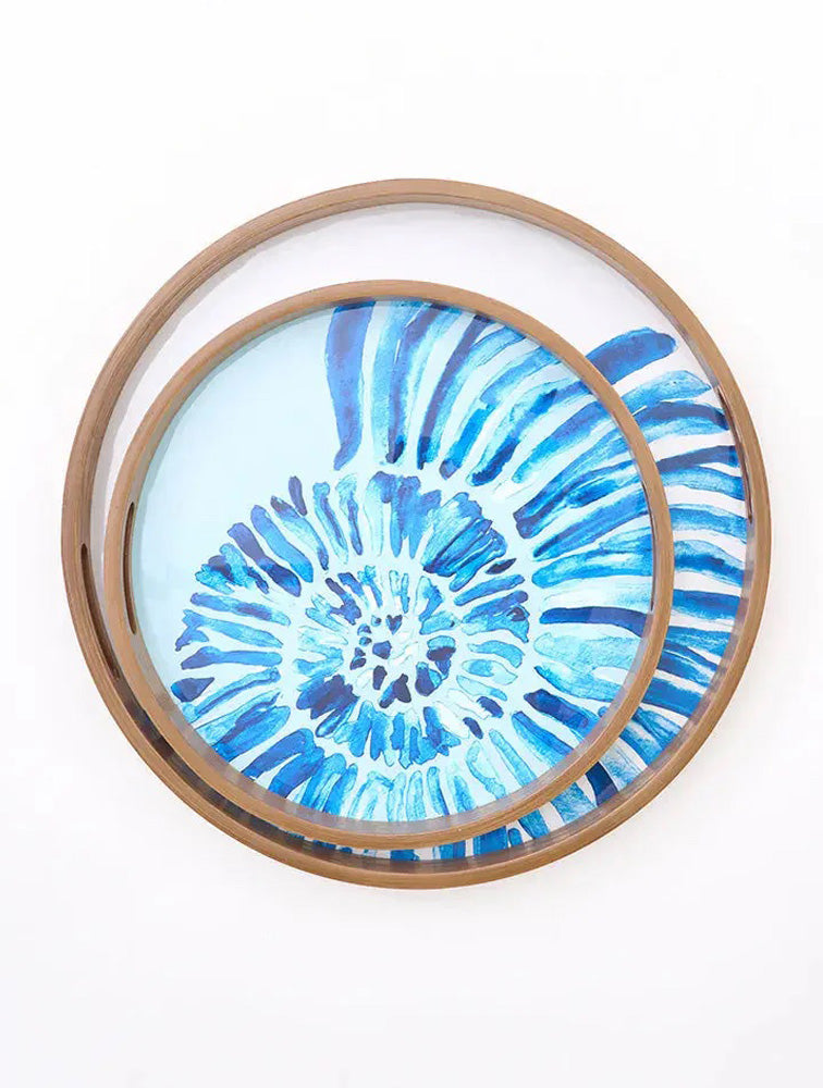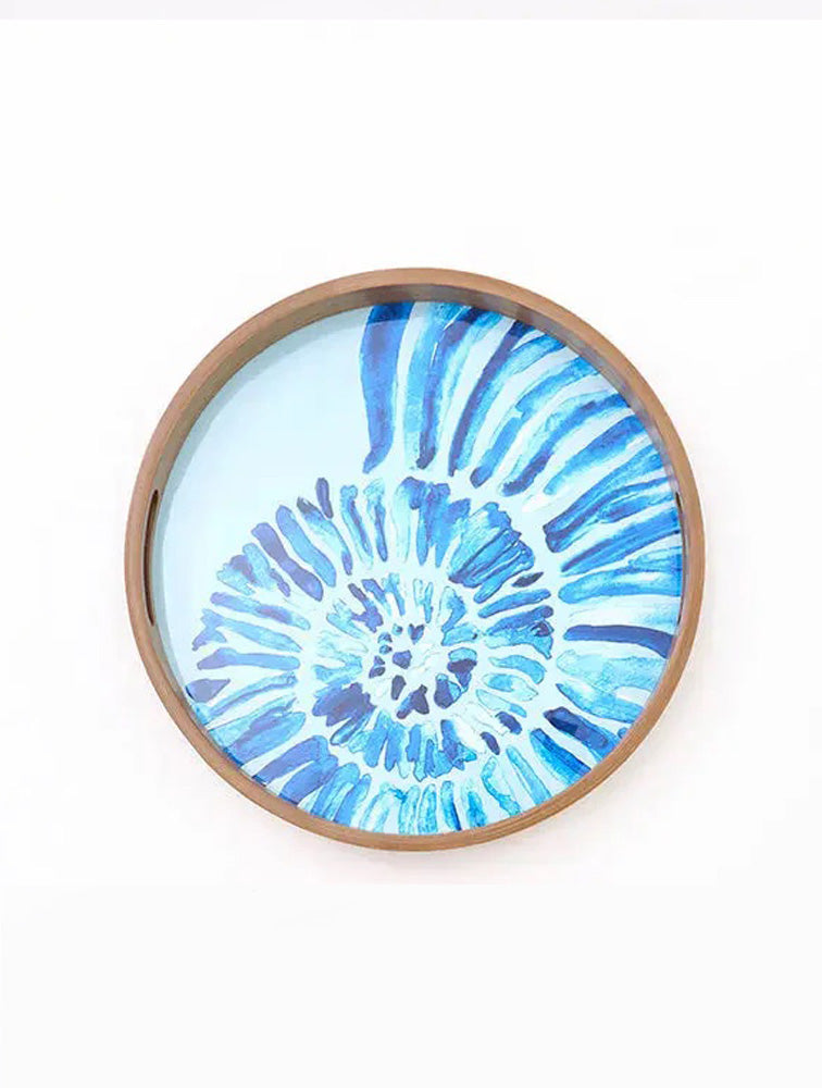 Bandeja de madera con base esmaltada con diseños marinos en tonos azules. funcionales y decorativas, estas bandejas son ideales para servir con estilo o como elementos decorativos. mide 45 cms de diametro.