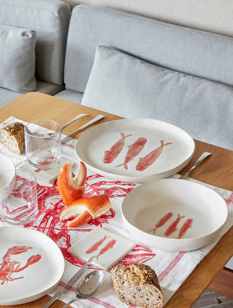 Plato grande con peces, fabricado en cerámica de alta calidad, una pieza perfecta para quienes desean agregar unâ toque náutico y eleganteâ a su vajilla. mide 29 cms de diámetro x 3 cms de alto.