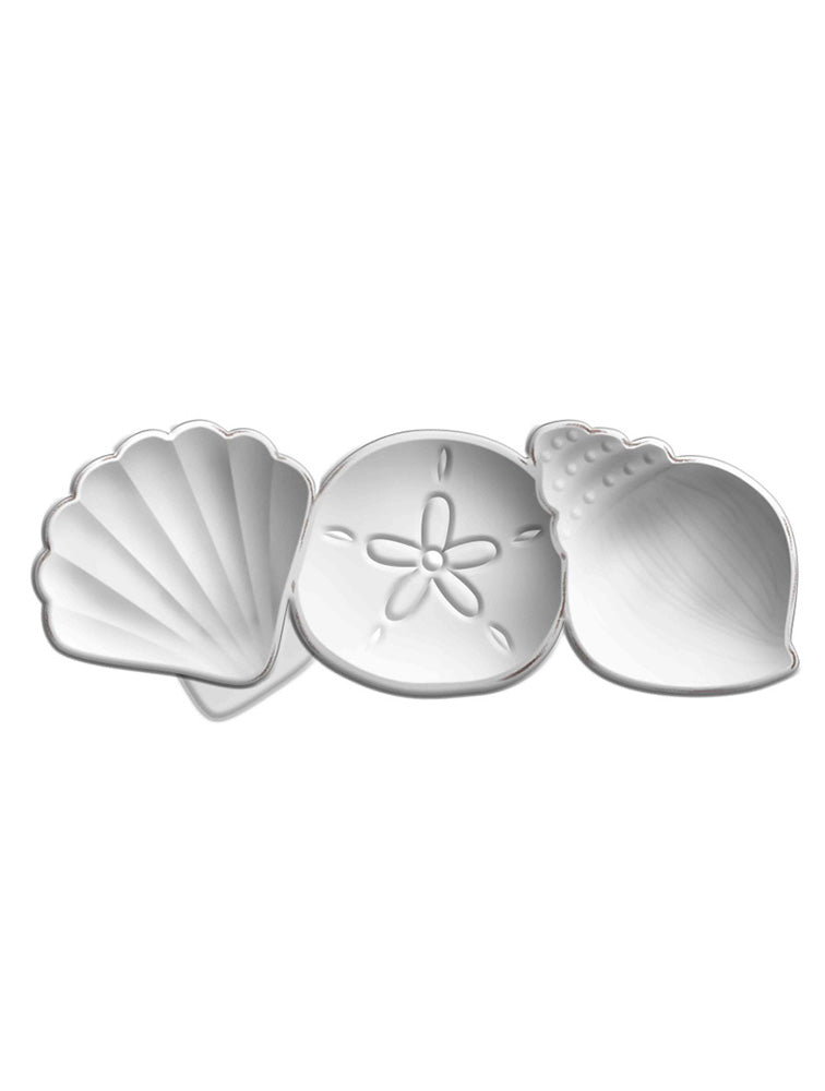 Fuente de cerámica blanca con 3 divisiones con diseño marino. ideal para piqueos y salsas. mide 33 cms de largo.