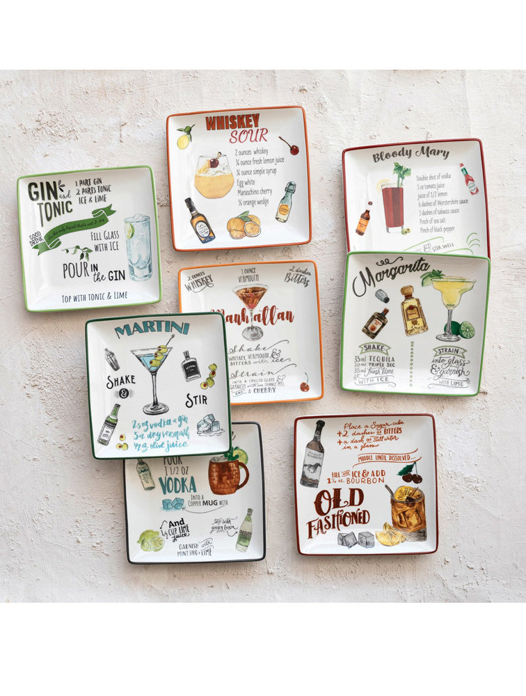 Divetido plato para piqueos con diseño de licores. puedes combinar con los demás modelos de la misma colección. miden 15.3 x 15.3 cms