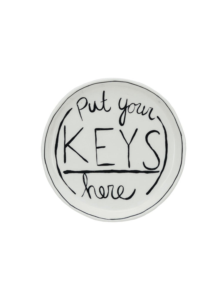 Platito o trinket redondo de cerámica con diseño divertido con la frase "put your keys here"o "pon tus llaves aquí". mide 14 cms de diámetro.