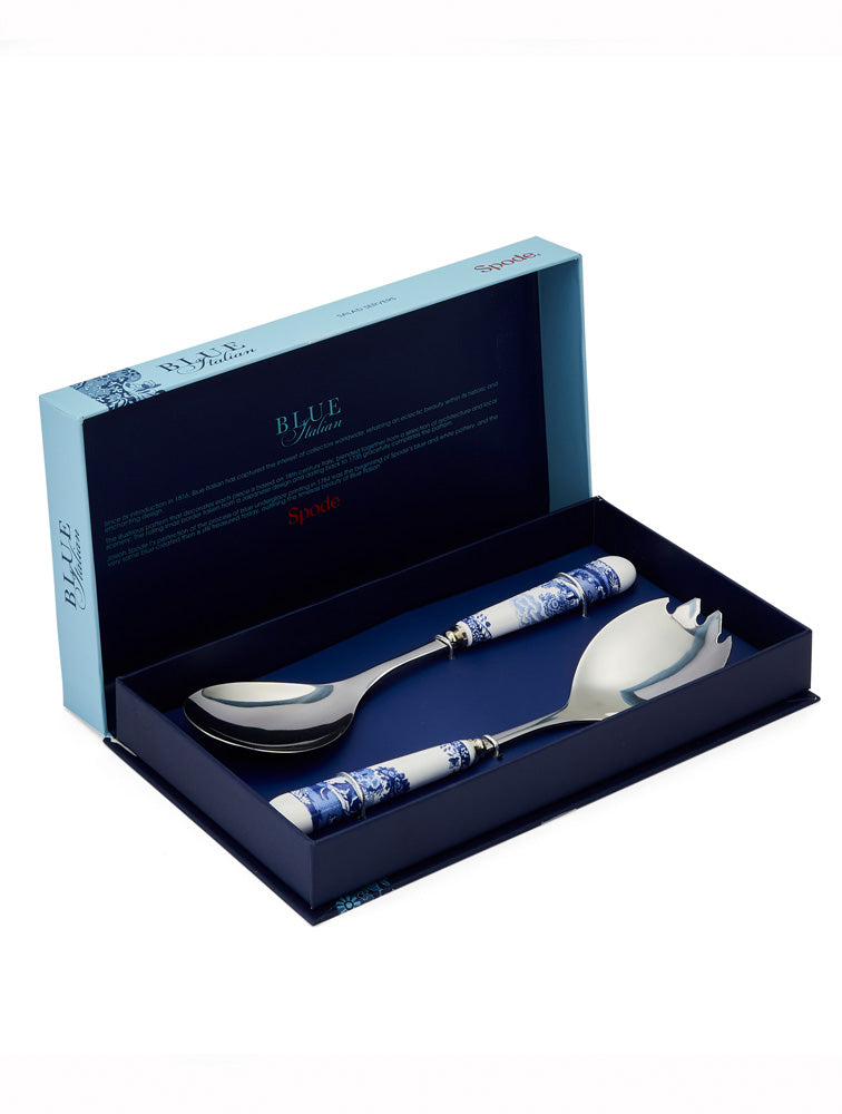 Set de 2 cubiertos para ensalada en acero inoxidable con mango de porcelana y diseno "blue italian". vienen en una linda caja azul.