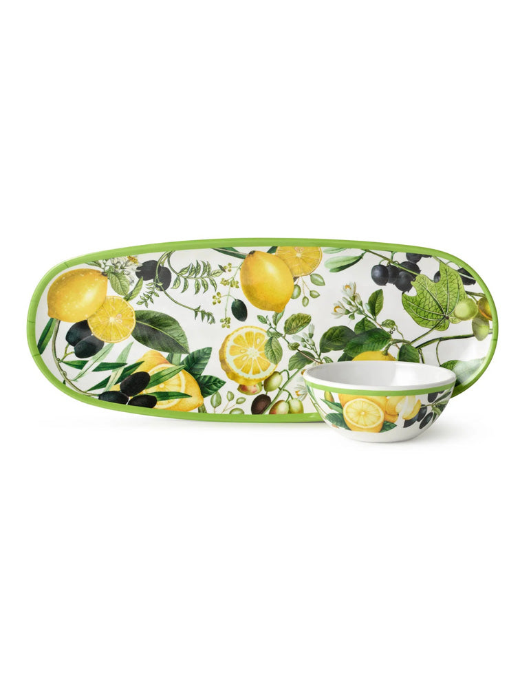 Elegante inspiración mediterránea plasmada en melamine. colección limone. fuente ovalada de melamine con bowl perfecto para piqueos. mide 38 x 15 cms y el bowl mide 12 cms de diámetro x 5.8 cms de alto.