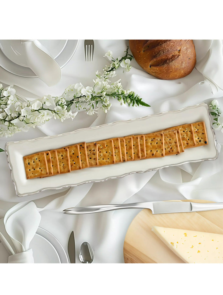 El refinado borde plateado de esta colección aporta un toque de glamour a cualquier ocasión de comedor, combinándose perfectamente con la decoración contemporánea y tradicional. colección regency. fuente rectangular en porcelana de 33 cms de largo x 8.89 cms de ancho.